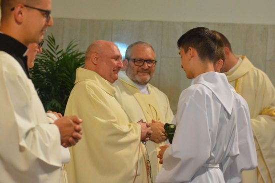 Na początku Eucharystii dzieci ze scholi złożyły życzenia ks. Dariuszowi, a następnie delegacja parafialna i ministranci.