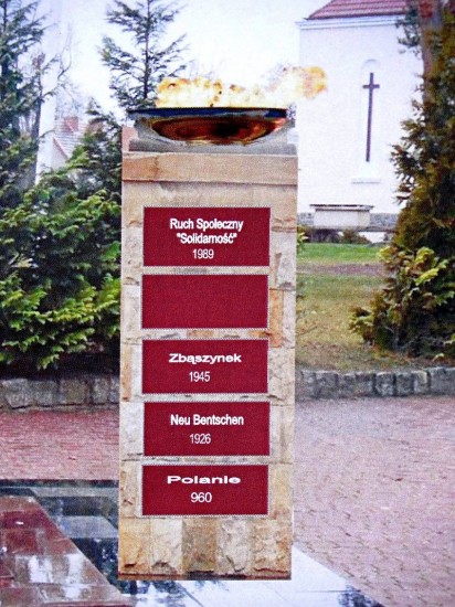 W projekcie prawej kolumny pomnika pozostawiliśmy jedną tablicę bez napisu. Nie oznacza to białej plamy.