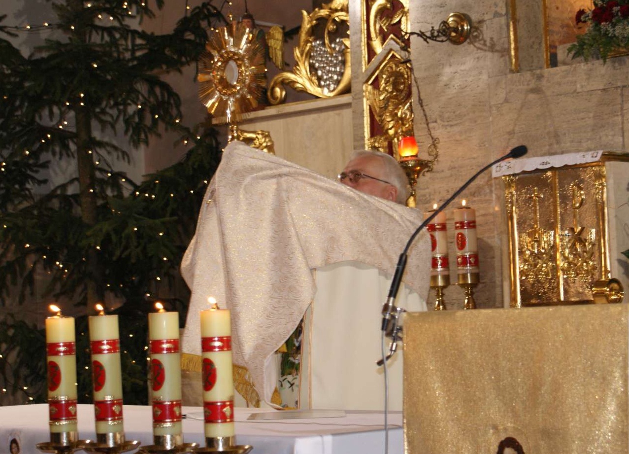 Przed północą o godz. 23,00, tradycyjnie od kilku lat, Wspólnota Królowej Pokoju prowadziła Różaniec, a o godz. 23,30 adorowano Pana Jezusa w Najświętszym Sakramencie. O godz. 0,00 rozpoczęła się uroczysta Msza św. w intencji parafii na rozpoczęcie Nowego 2014 Roku, którą celebrował Proboszcz ks. kan. Jerzy Kordiak.