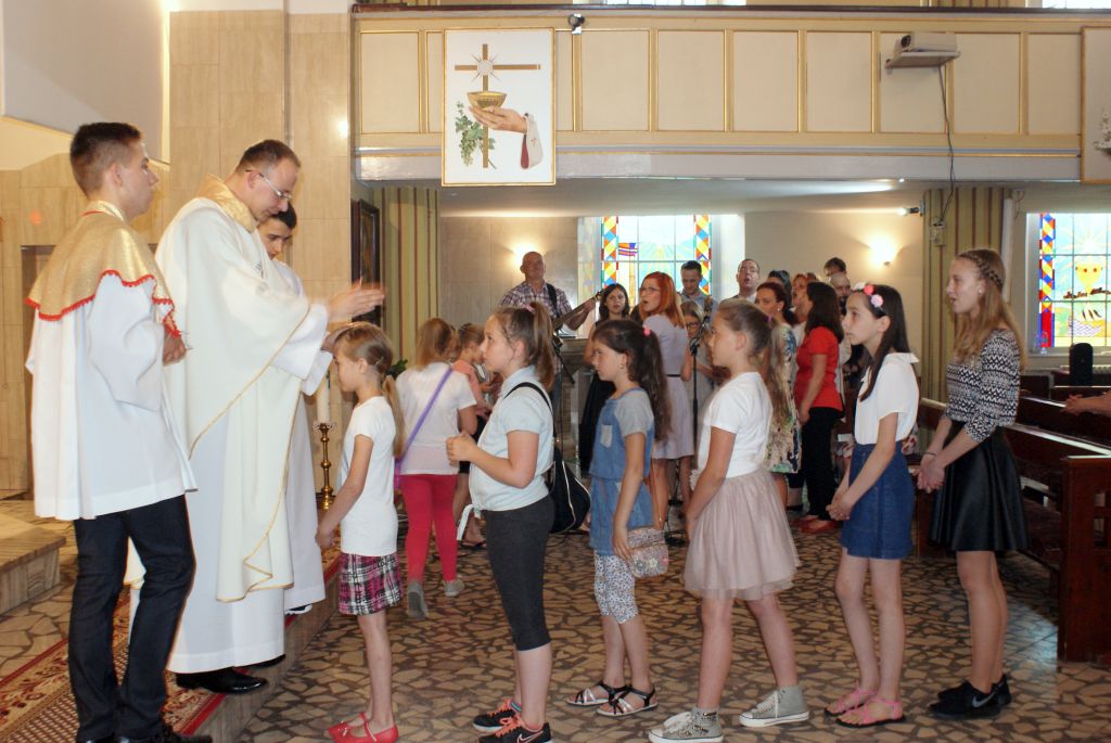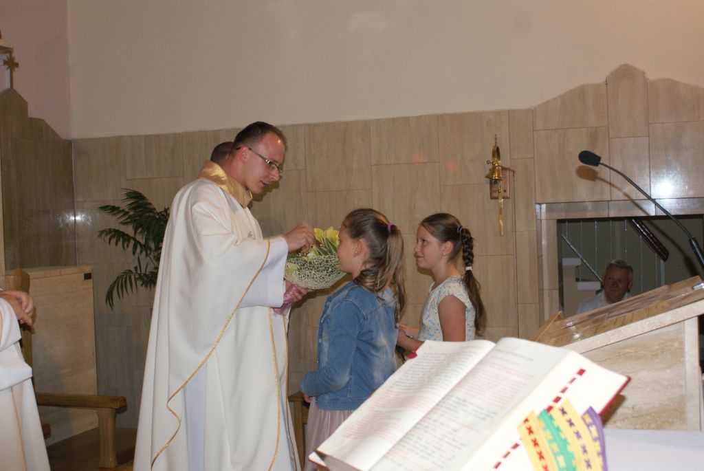 03.06.2016r. o godz. 18,30 przeżywaliśmy Mszę św., którą sprawował w asyście Proboszcza ks. kan. Jerzego Kordiaka i Wikariusza ks. Norberta Lasoty neoprezbiter ks. Łukasz Sławiński, który również wygłosił homilię na temat powołania kapłańskiego. Ks. Łukasz w 2014 roku odbywał jako Diakon półroczną praktykę duszpasterską w naszej parafii.