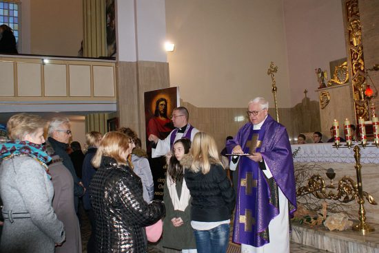 Podczas Mszy św. kapłani: Proboszcz ks. kan. Jerzy Kordiak, Wikariusz ks. Norbert Lasota i kleryk Mateusz Topolski posypywali wiernym głowy popiołem wzywając: „nawracajcie się i wierzcie w Ewangelię”, „z prochu jesteś i w proch się obrócisz”.
