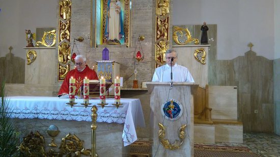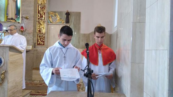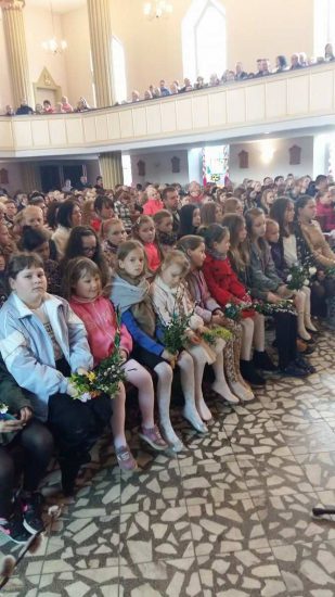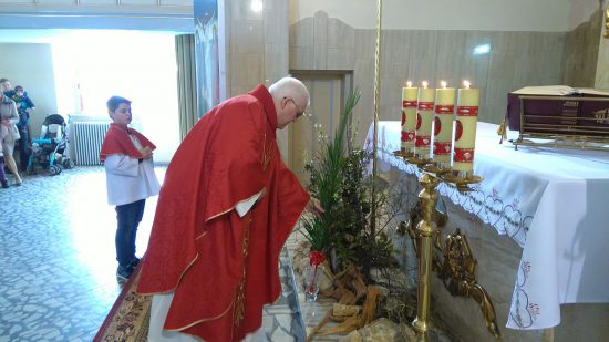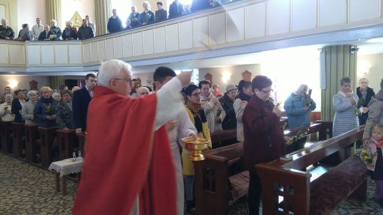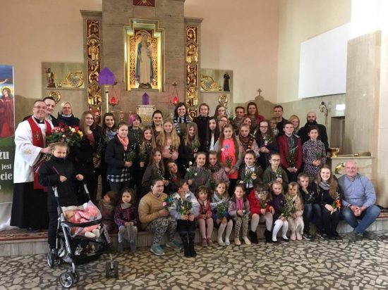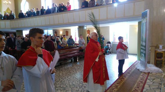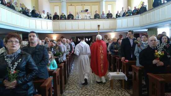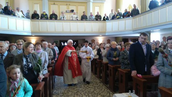 Mszę św. o godz. 09:30 rozpoczęła procesja dzieci z palmami. Ks. Wikariusz Norbert Lasota poświęcił gałązki palmowe i zaraz po tym wprowadził procesyjnie dzieci, które z radosnym śpiewem HOSANNA wznosiły w górę palmy na pamiątkę wjazdu Chrystusa do Jerozolimy. Liturgię Niedzieli Palmowej podczas Mszy św. rozpoczynającej Wielki Tydzień uświetniły obie