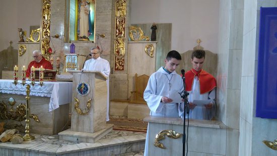 Mszę św. o godz. 09:30 rozpoczęła procesja dzieci z palmami. Ks. Wikariusz Norbert Lasota poświęcił gałązki palmowe i zaraz po tym wprowadził procesyjnie dzieci, które z radosnym śpiewem HOSANNA wznosiły w górę palmy na pamiątkę wjazdu Chrystusa do Jerozolimy. Liturgię Niedzieli Palmowej podczas Mszy św. rozpoczynającej Wielki Tydzień uświetniły obie