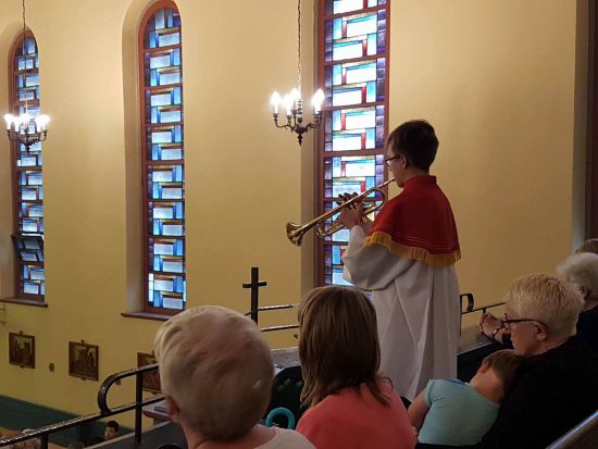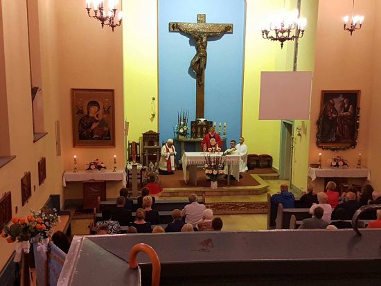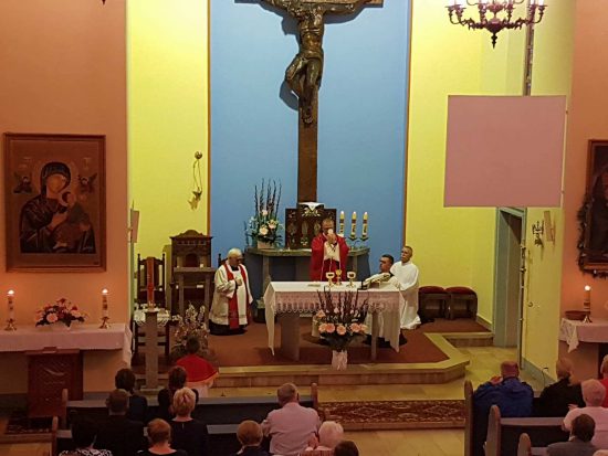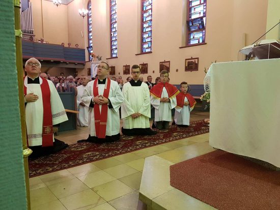 Po adoracji Najświętszego Sakramentu i odśpiewaniu Litanii do Najświętszego Serca Pana Jezusa została odprawiona uroczysta Msza św., którą w asyście Proboszcza ks. kan. Jerzego Kordiaka i ks. kleryka Mateusza Topolskiego celebrował gość ks. Tomasz Gierasimczyk z Wydziału Duszpasterskiego Kurii Diecezjalnej.