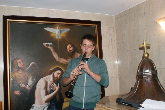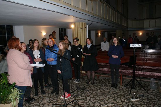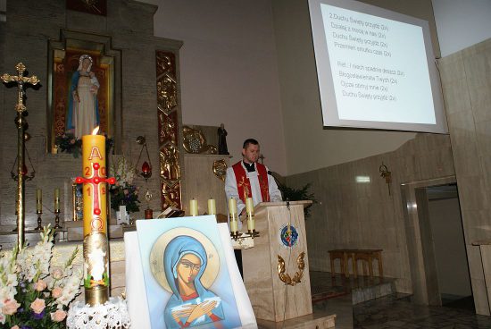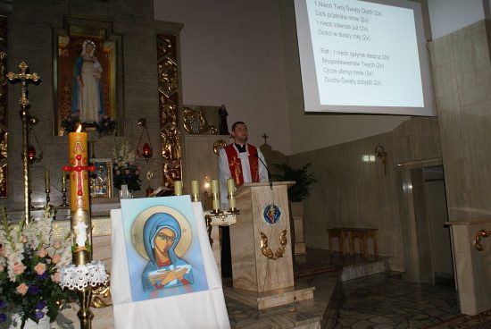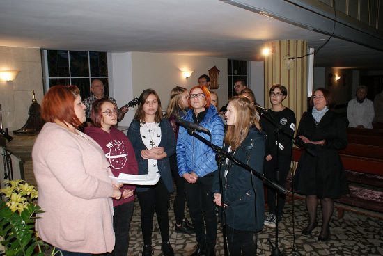 Modlitwę uwielbienia prowadził po raz pierwszy nasz nowy Wikariusz ks.Jakub Świątek, a Schola Młodzieżowa między modlitwami pięknie śpiewała pieśni. Scholę wsparł grając na gitarze i śpiewając ks. kleryk Mateusz Topolski.