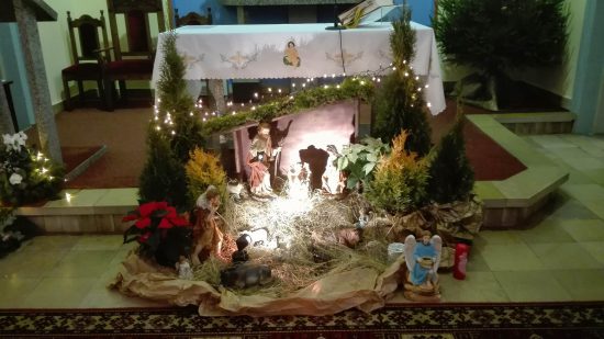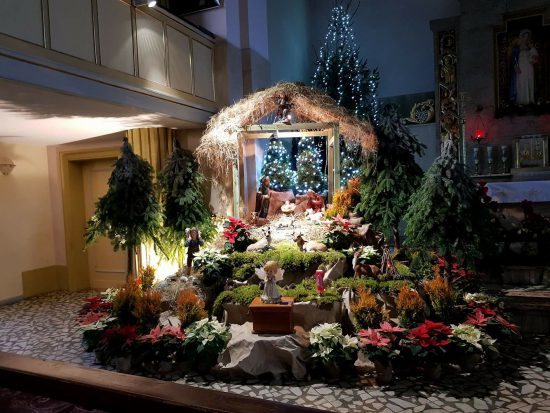 Przed ołtarzem wykonano piękną dekorację, pośród której leży figurka dzieciątka Jezus, którą kapłani kładli podczas Pasterek.