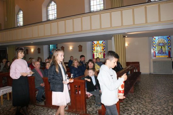 przedstawiciele scholi dziecięcej niosą Dary OłtarzaKs. Proboszcz podziękował wiernym za uczestnictwo we Mszy św. i ofiarowaną Komunię św. w Jego intencji, za życzenia i obsługę liturgiczną Mszy św, a na zakończenie Eucharystii wszystkim zgromadzonym parafianom udzielił błogosławieństwa.