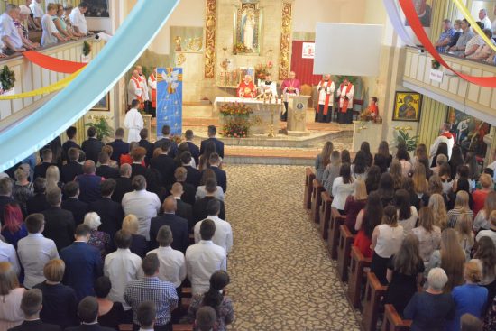 „We wtorek 29.05.2018r., w kościele parafialnym pw. Macierzyństwa NMP ks. Biskup Adam Dyczkowski udzielił 110 uczniom z parafii: Babimost, Brójce, Dąbrówka Wlkp., Kosieczyn oraz Zbąszynek, Sakramentu Bierzmowania. Uroczystość rozpoczęła się o godz. 17:00. Zbąszynecki Kościół zakwitł wiosną – św. Jan Paweł II niejednokrotnie tak właśnie określał młodych ludzi.