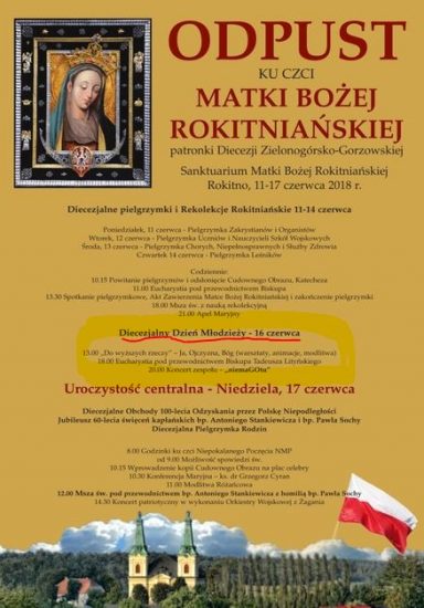 W dniach 11-17.06.2018r. odbył się Odpust ku czci Matki Bożej Rokitniańskiej – Patronki naszej Diecezji Zielonogórsko-Gorzowskiej. Codziennie od 11 do 14 czerwca do Sanktuarium przybywały diecezjalne pielgrzymki różnych grup, które brały udział w rekolekcjach rokitniańskich.