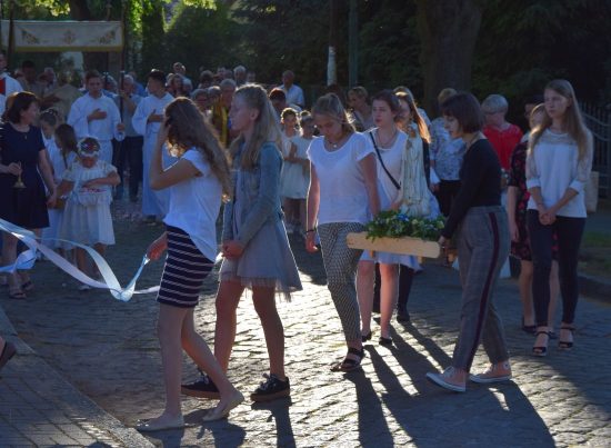 Po Mszy św. odbyła się procesja z Najświętszym Sakramentem do 4 ołtarzy wokół świątyni. Najświętszy Sakrament nieśli i udzielali błogosławieństwa na przemian ks. Proboszcz i ks.Wikariusz. Podczas procesji dziewczynki sypały kwiatki, młodzież niosła poduszki i figurę Matki Bożej Fatimskiej, a członkowie Wspólnoty Królowej Pokoju – figurę Królowej Pokoju, parafianie nieśli sztandary.