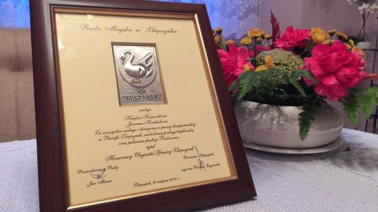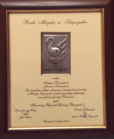Burmistrz Miasta Zbąszynek Wiesław Czyczerski wręczył tytułu Honorowego Obywatela Gminy Zbąszynek, który Uchwałą Rady Miejskiej w Zbąszynku z dnia 30.08.2018r. nadano Proboszczowi naszej parafii ks. kan. JERZEMU KORDIAKOWI .