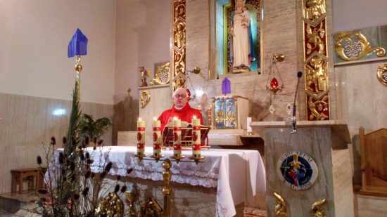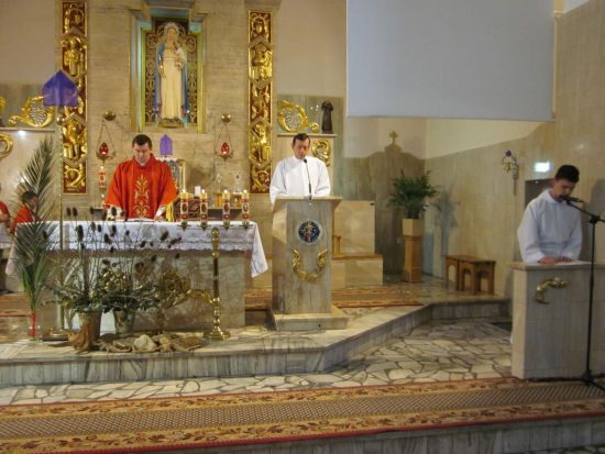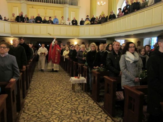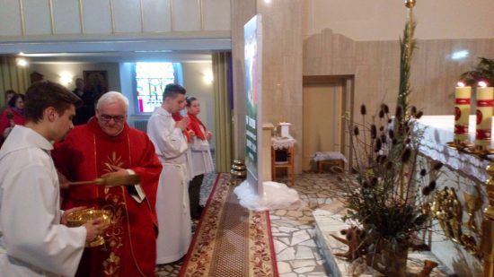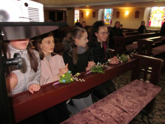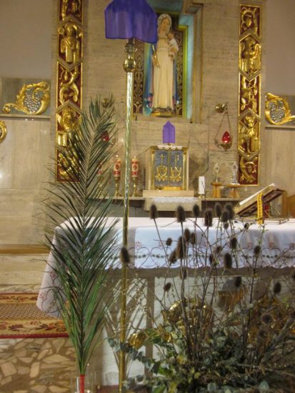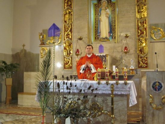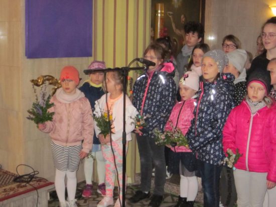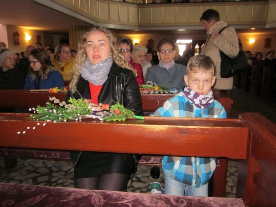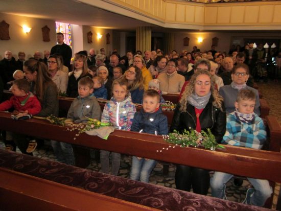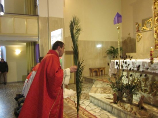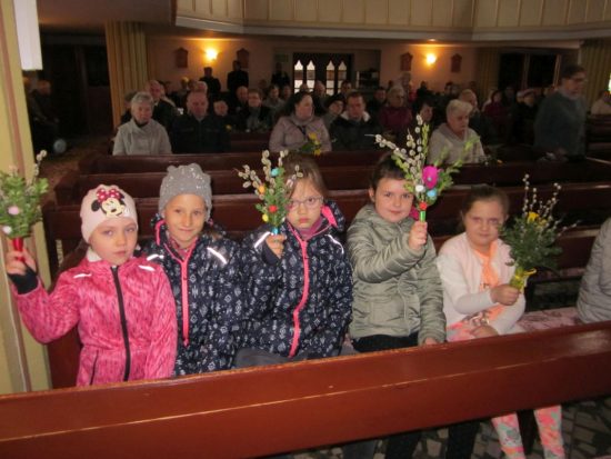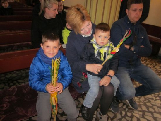 Mszę św. o godz. 09:30 celebrował Ks. Wikariusz Jakub Świątek, który poświęcił palmy przyniesione przez wiernych. Liturgię Niedzieli Palmowej podczas Mszy św. rozpoczynającej Wielki Tydzień uświetniła schola dziecięca oraz służba liturgiczna ołtarza , która czytała Mękę Pana Jezusa.