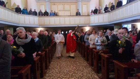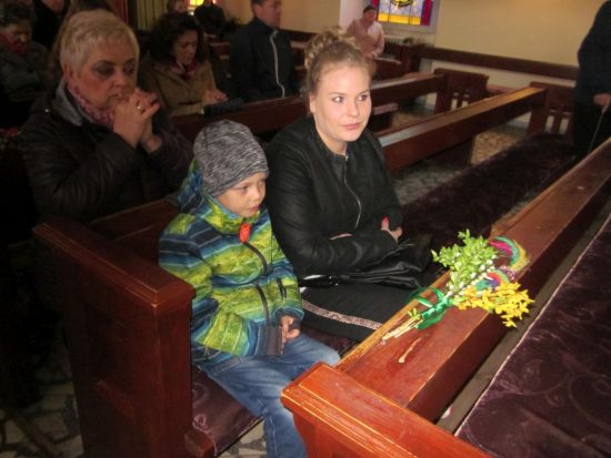Mszę św. o godz. 11:00 celebrował Proboszcz ks. kan. Jerzy Kordiak. Na początku Mszy, tak jak na każdej Eucharystii w tym dniu zostały poświęcone palmy, a Ewangelię według św. Łukasza odczytano także z podziałem na role.