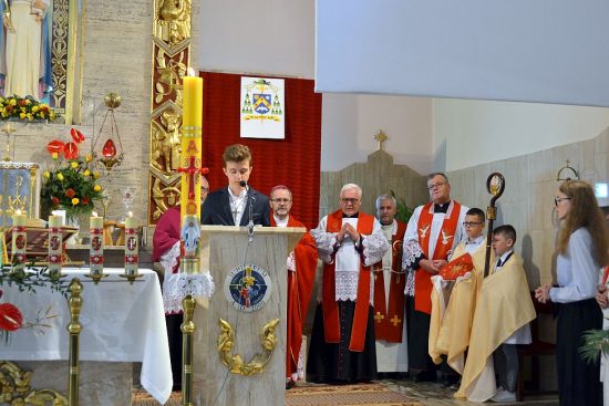 Młodzież pięknie przygotowała animację liturgii Słowa czytając lekcje, modlitwę powszechną oraz niosła dary ołtarza, a schola parafialna uświetniła uroczystość.