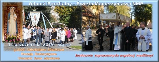 11.10.2019 r. nasza parafia przeżywała swoje wielkie święto – Odpust Parafialny. W szczególny sposób dziękowaliśmy Matce Bożej – patronce naszej parafii – za Jej Macierzyńską opiekę. Uroczystość poprzedziła 3 dniowa adoracja Najświętszego Sakramentu.