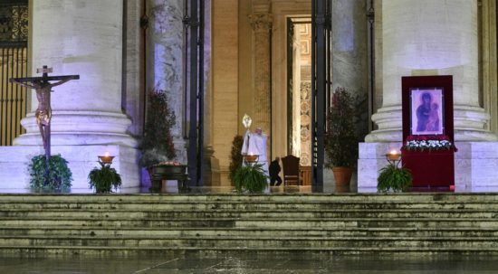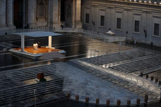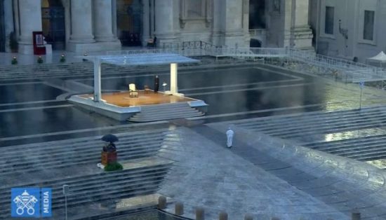 27.03.2020 r. w piątek w strugach deszczu Papież Franciszek modlił się przy pustym placu św. Piotra o ustanie epidemii koronawirusa i błogosławieństwo dla wszystkich ludzi. Modlitwa na pustym placu i przed pustą bazyliką Świętego Piotra rozpoczęła się od odczytania fragmentu Ewangelii św. Marka o burzy na jeziorze, podczas której przelęknieni Apostołowie obudzili śpiącego Jezusa, prosząc, by ocalił ich przed nawałnicą.