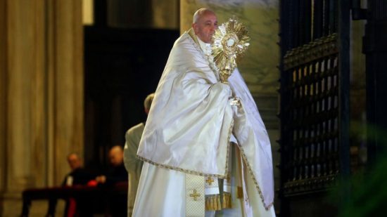 Po błaganiach o miłosierdzie i adoracji Najświętszego Sakramentu Papież Franciszek udzielił monstrancją błogosławieństwa Urbi et Orbi przy biciu dzwonów bazyliki Świętego Piotra.