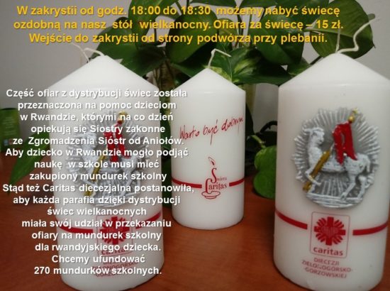 W zakrystii od godz. 18:00 do 18:30 możemy nabyć świecę ozdobną na nasz stół wielkanocny. Ofiara za świecę – 15 zł. Wejście do zakrystii od strony podwórza przy plebanii.