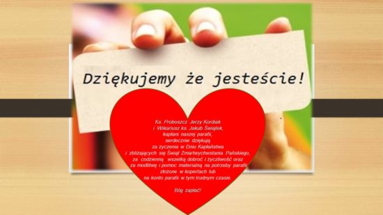 Ks. Proboszcz Jerzy Kordiak i Wikariusz ks. Jakub Świątek, kapłani naszej parafii, serdecznie dziękują za życzenia w Dniu Kapłaństwa i zbliżających się Świąt Zmartwychwstania Pańskiego, za codzienną wszelką dobroć i życzliwość oraz za modlitwę i pomoc materialną na potrzeby parafii złożone w kopertach lub na konto parafii w tym trudnym czasie.  Bóg zapłać!