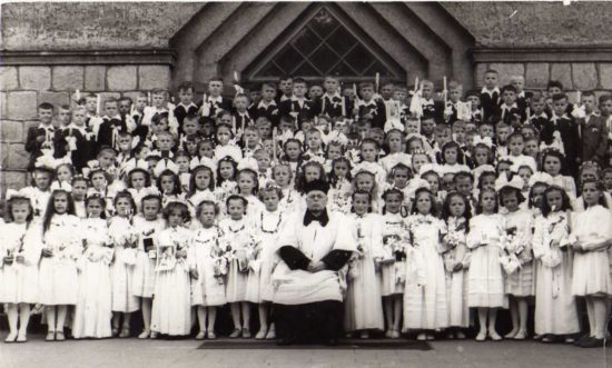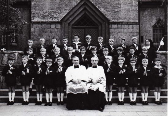 ks. Proboszcz Jan Pipusz z dzieć mi pierwszokomunijnymi, V.1955 r. (foto: Teresa Florczyk-Baszko)