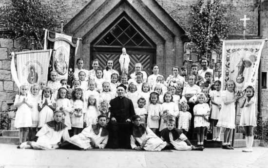 ks. Proboszcz Franciszek Wyszatycki z dziećmi po procesji Oktawy Bożego Ciała, 1950 r. (foto: Czesława Wieczorek)