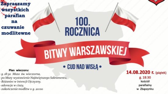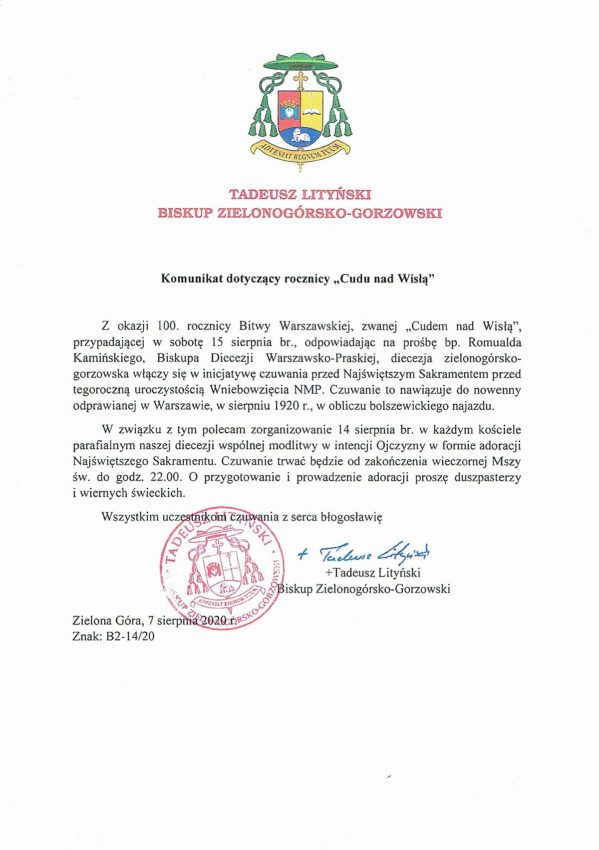 Ordynariusz naszej diecezji Ks. Bp Tadeusz Litński wydał 07.08.2020 r. Komunikat dotyczący rocznicy „Cudu nad Wisłą”. Polecił w każdym kościele parafialnym naszej diecezji zorganizowanie 14 sierpnia w piątek wspólnej modlitwy w intencji Ojczyzny w formie adoracji Najświętszego Sakramentu.