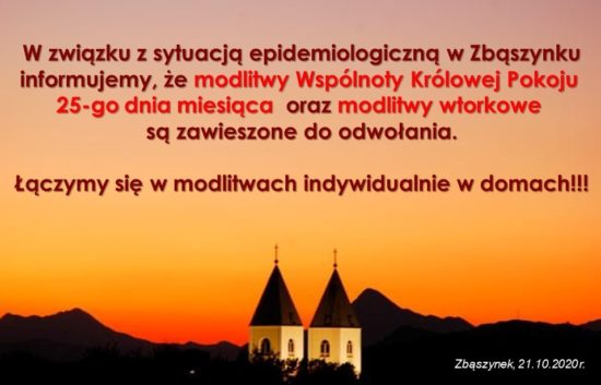 W związku z sytuacją epidemiologiczną w Zbąszynku informujemy, że modlitwy Wspólnoty Królowej Pokoju 25-go dnia miesiąca oraz modlitwy wtorkowe są zawieszone do odwołania.